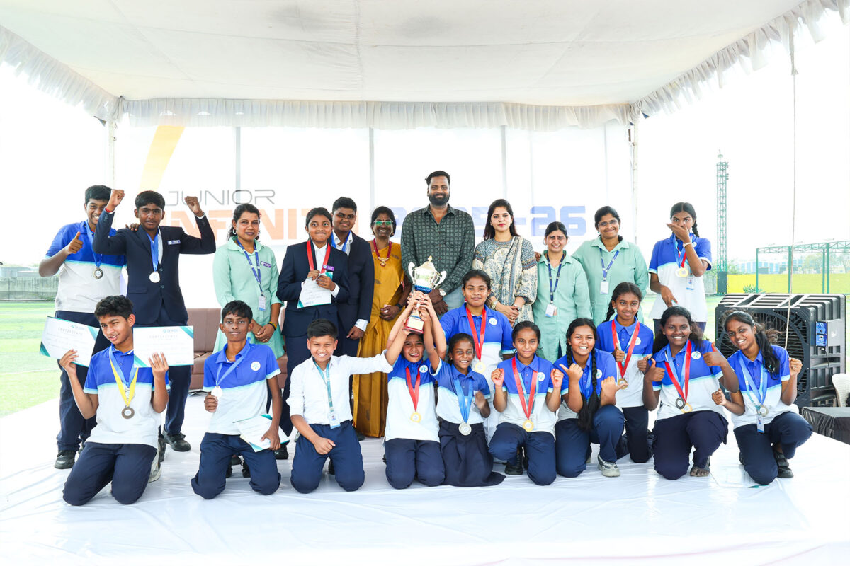 Junior Infinito 2025–26: A Grand Celebration of Sportsmanship and Young Champions Junior Infinito 2025–26, the Annual Sports Meet of SV High School, Vanagaram, was celebrated with great enthusiasm and sportsmanship. Students from Play Group to Grade IX actively participated in various track and field events, showcasing their athletic talent, teamwork, and discipline. The event was graced by an International Volleyball Player as the Chief Guest, whose inspiring presence motivated the young athletes. The sports meet began with a formal inauguration ceremony including Tamil Thai Vazhthu, Welcome Address, Flag Hoisting, March Past, Torch Lighting, and Oath Taking, officially declaring the sports meet open. This was followed by the Annual Sports Report, Director’s Address, Chairman’s Speech, and Chief Guest’s inspiring message. Students competed in various running races from Play Group to Grade IX, along with Obstacle Races for Pre-KG to Grade III, Shot Put for Grade V, and Kabaddi matches for Grades VI to IX. The event also featured impressive performances such as Small Duster Drill, Bat Drill, Wand with Ribbon Drill, Yoga Demonstrations, Silambam, and Karate, highlighting physical fitness, coordination, and discipline. More than 200+ students participated in different competitions. The competition was conducted among four houses — Ruby, Amethyst, Emerald, and Citrine. Ruby House secured 785 points and emerged as the Overall Champion, followed by Amethyst with 595 points, Emerald with 575 points, and Citrine with 475 points. In the Kabaddi Championship, Emerald House won in Grades VI–VII, while Citrine House secured victory in Grades VIII–IX, with Amethyst House finishing as runner-up in both categories. The Prize Distribution Ceremony recognized winners from Pre-KG to Grade IX events and the Parent Special Events. The celebration concluded with the Vote of Thanks, Unfurling of the Flag, and the National Anthem. Junior Infinito 2025–26 was a memorable celebration of sportsmanship, teamwork, and holistic development, reflecting the commitment of SV High School, Vanagaram to nurture confident and active young achievers.